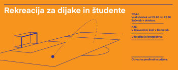 - REKREACIJA ZA MLADINO 2025/26Rekreacija za mladino bo vsak četrtek v telovadnici OŠ Komenda od 21.00 do 22.30. Vabljeni!